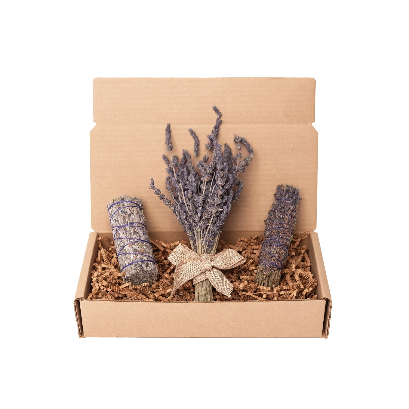 Contains one lavender bud saining stick, one lavender stem saining stick, and one mini bunch of lavender tied with a ribbon.