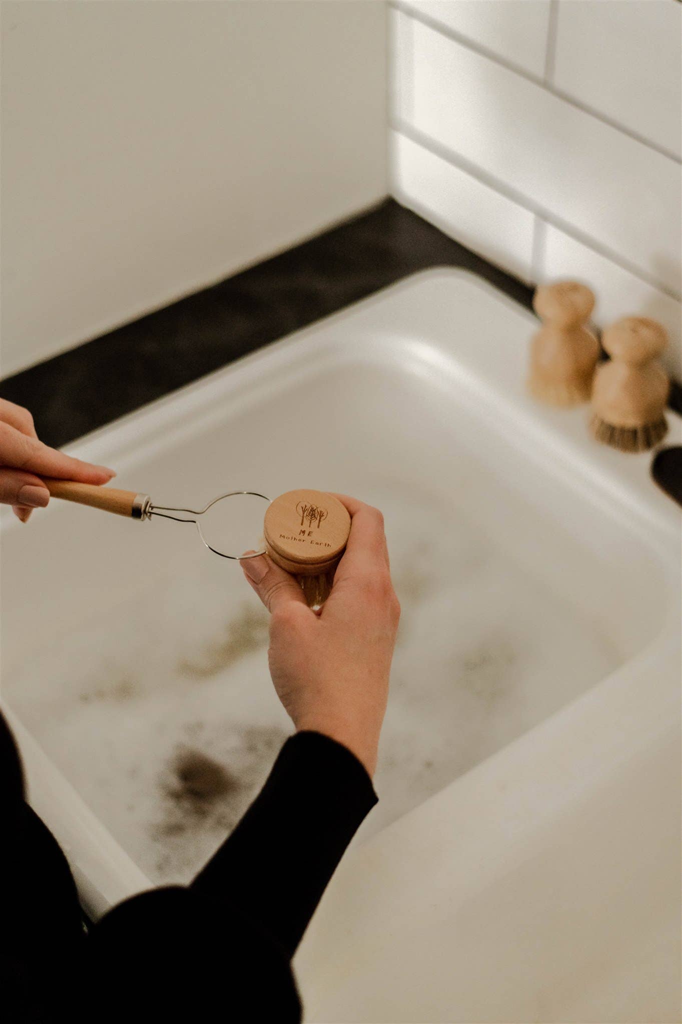 Great for everyday cleaning; gently and effectively scrubs dish ware, glassware, pots and pans, inside jars, etc. Hang to dry in between uses, on a dry towel or elevated to allow bristles to drain. Never leave soaking in water as it will wear on the wood causing it to crack or may cause the natural bristles to fall out.